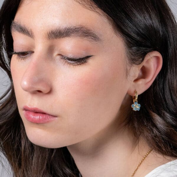 Et Lite Stykke Eventyr: Disse øredobbene er designet for å sitte tett og fint på øreflippen (derav navnet «huggies»). Fra den elegante, forgylte ringen henger en bitteliten, nydelig Forglemmegei-blomst, som er møysommelig håndmalt i emalje i beroligende og vakre blåtoner. Hele øredobben har en varm, 22k ‘worn gold’-forgylt finish, som gir den et mykt og luksuriøst vintage-preg.