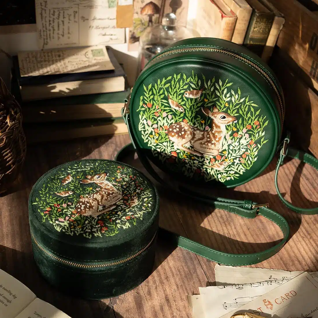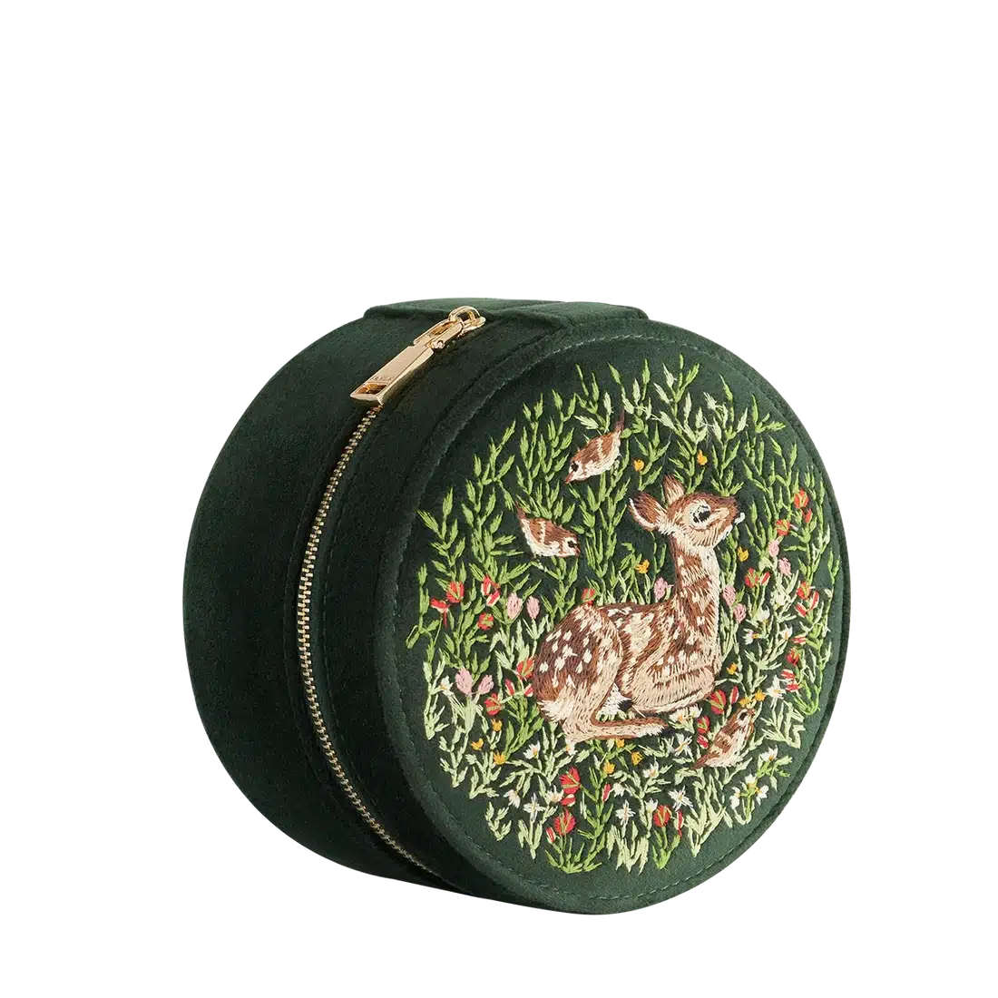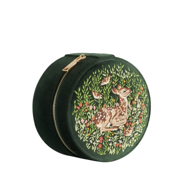 Fable smykkeskrin Brodert rådyr (Chloe Giordano) – Grønn Fløyel: Oppbevar skattene dine i et lite kunstverk! 🦌🌿 Dette eksklusive smykkeskrinet er resultatet av et drømmesamarbeid mellom Fable England og den anerkjente tekstilkunstneren Chloe Giordano.