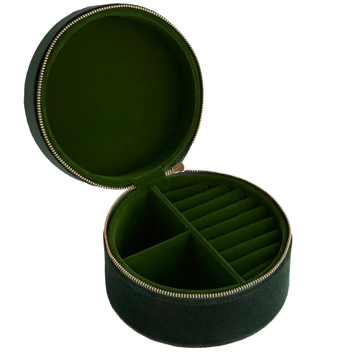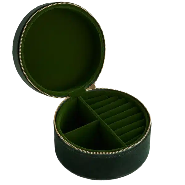 Luksuriøs Fløyel: Hele skrinet er trukket i en dyp, skoggrønn fløyel som føles myk og eksklusiv å ta på. Den gylne glidelåsen med Fable-logoen setter prikken over i-en og gir skrinet et elegant uttrykk.