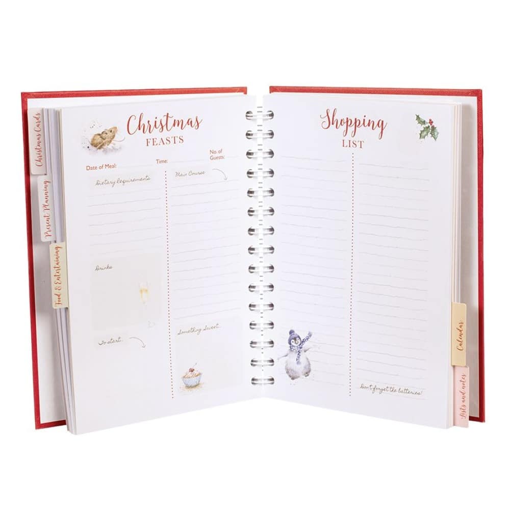 Planleggeren inkluderer julekortlister, gaveplanlegging, mat og underholdning, festkalender, lister og notatsider. Det er plass for oppskrifter og notater. Du kan oppbevare kvitteringer og ønskelister i en praktisk lomme på baksiden og bruke de to arkene med klistremerker til å pynte konvolutter og gaver.