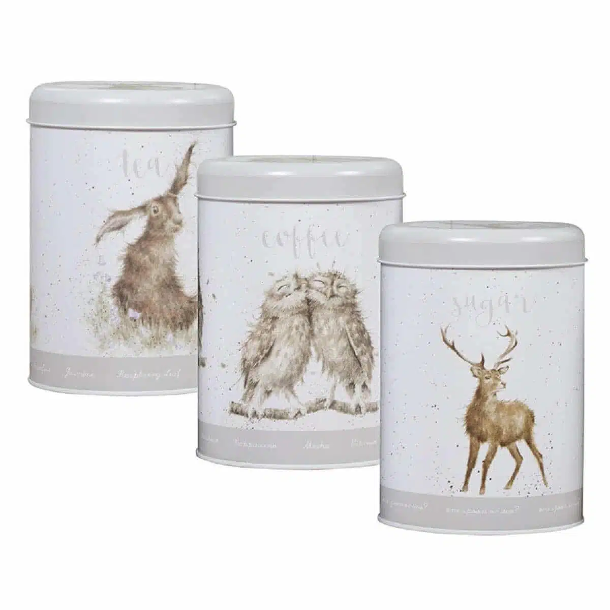 Wrendale sett med bokser består av tre bokser merket Tea, Coffee og Sugar. Flotte bokser i metall, dekorert med en hare, en hjort og to ugler. Boksene er dekorert på alle sider, både på lokket og inne i boksen.